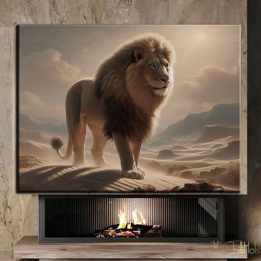 Зображення лева, втілене на полотні, символізує мужність, силу та владу, водночас привносячи в приміщення ауру магії та енергії. Пустеля, що оточує цього величного хижака, створює відчуття широких просторів та вільності, допомагаючи вам відчути себе вільними від буденних турбот.
